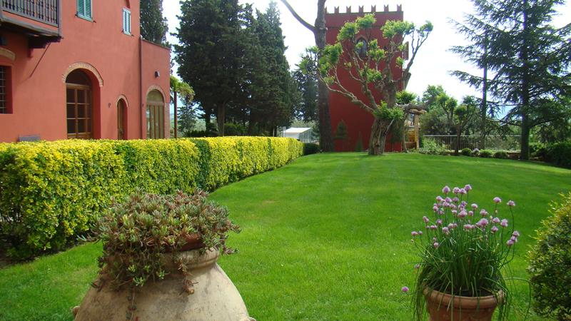 La piscina, anticipata dal prato, è immersa in una rigogliosa e controllatissima vegetazione,
